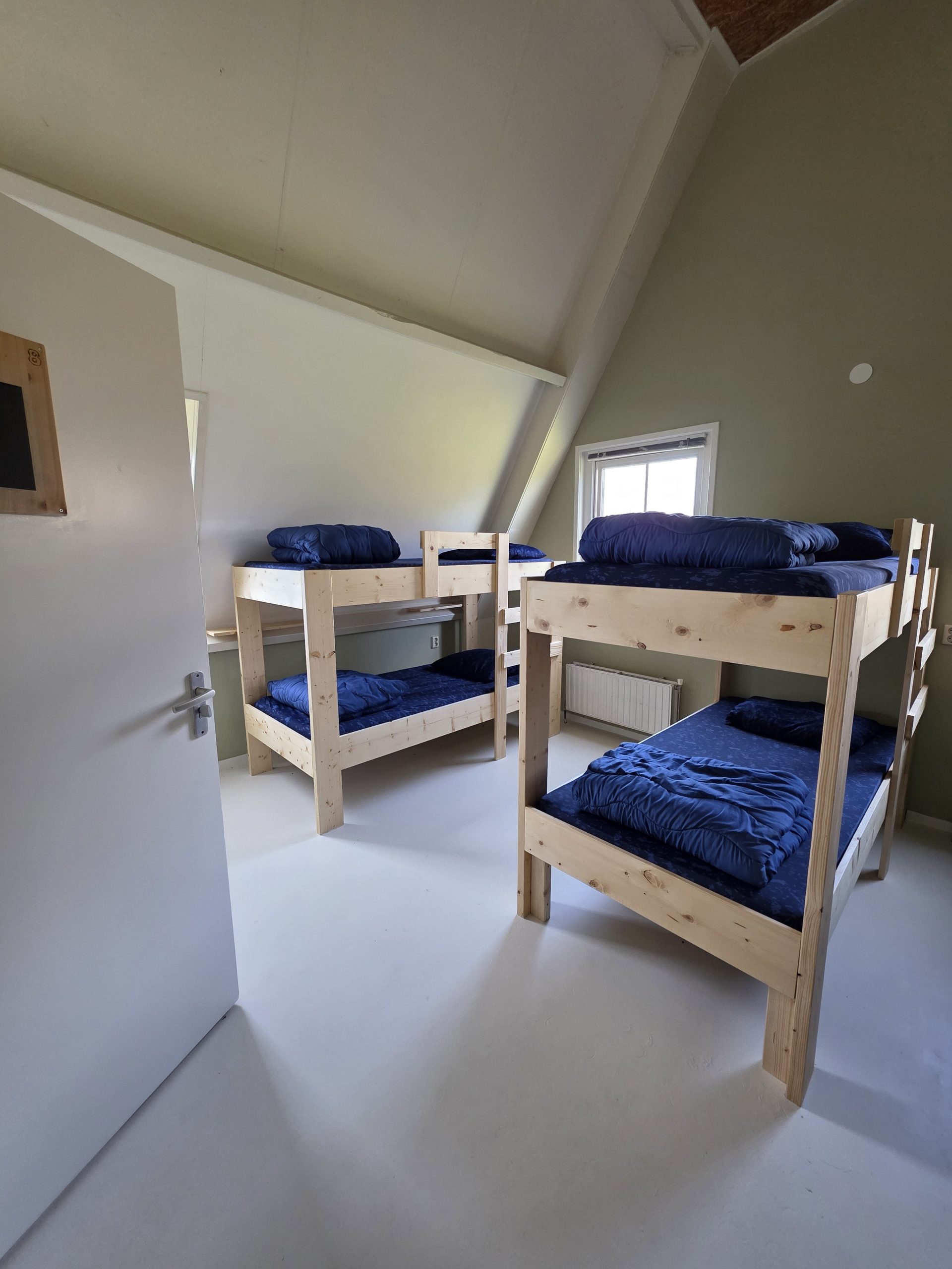 Op de slaapkamers zijn stevige houten stapelbedden gebouwd. De slaapkamers zijn ingedeeld in 2 tweepersoonskamers, 2 driepersoonskamers, 2 vierpersoonskamers en twee slaapzalen voor 6 personen.